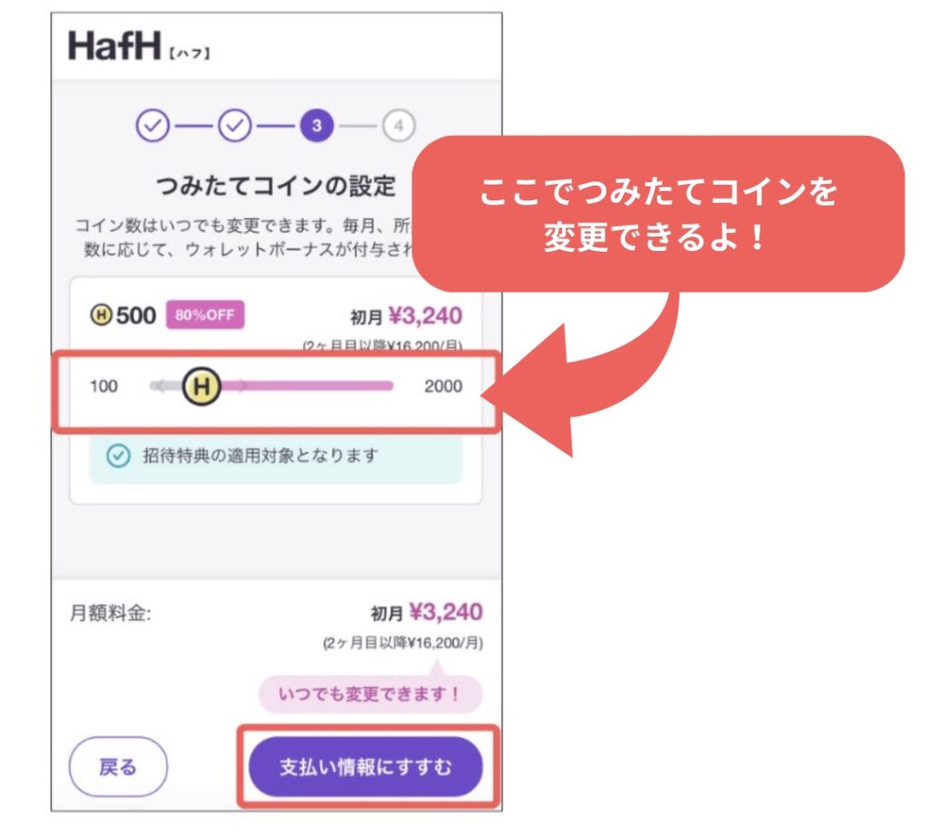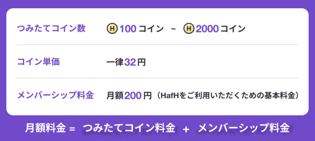 HafHに登録したら、2ヶ月目から4ヶ月目の間(3ヶ月間)、毎月50コインがプレゼントされるよ!