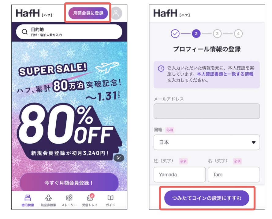 HafHではコインをつみたてて、宿泊先や航空券を予約するよ!