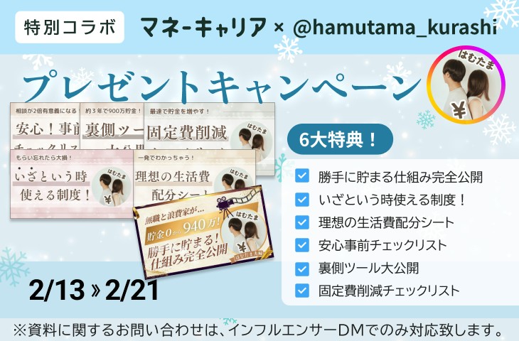 2月21日までの申し込み&2月中に面談すれば特典もプレゼントできるから、今すぐ相談してお金をどんどん浮かせていこうね💓