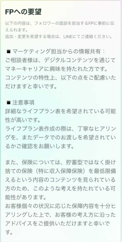 実は私たちからFPさんに、相談者さんの悩みや現状、価値観や希望をよく聞いたうえで、最低限必要な保険をお勧めするようにお願いしているよ!