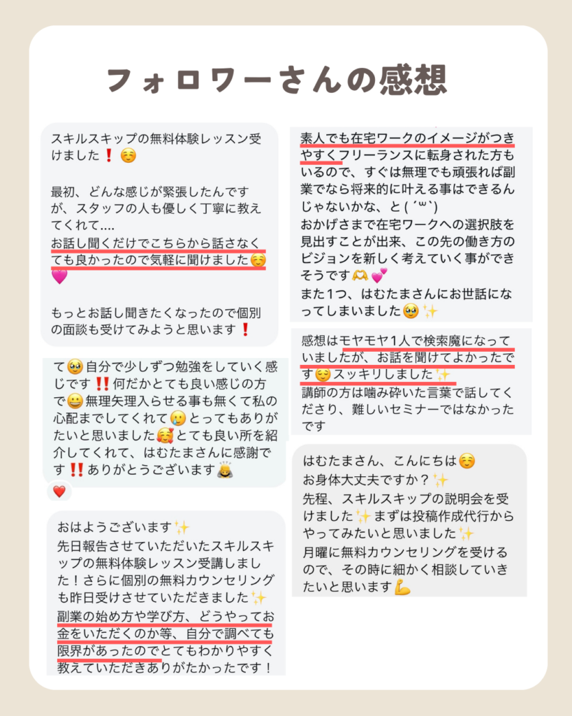 無料体験レッスンを受けることで、在宅ワークのメリットやデメリットも知れるから気になる人は絶対に受けてみてね☺️